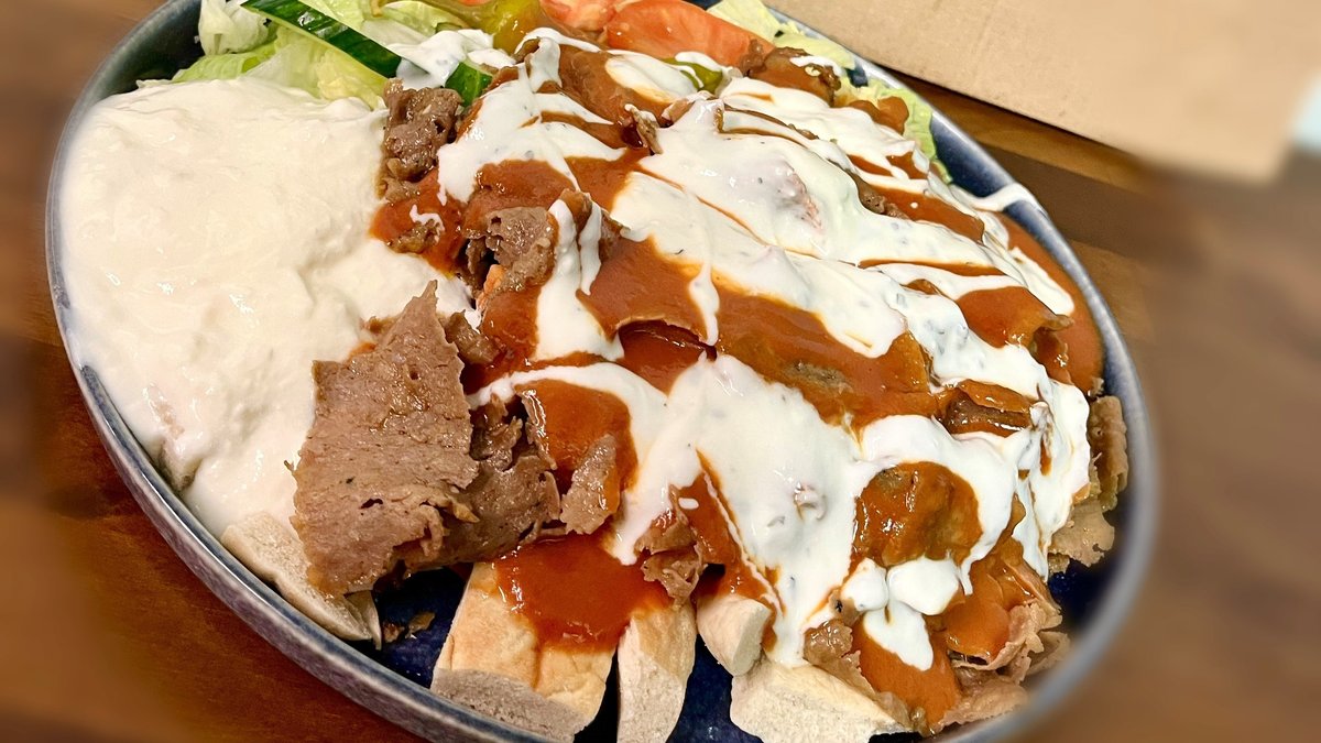 Pehmeitä pitaleivän paloja, joiden päällä herkullista kebab lihaa, sekä kebab kastiketta ja/tai valkosipulikastiketta oman valinnan mukaan. Lisäksi annoksen kruunaa talon oma maustamato jogurtti. Annokseen kuuluu myös oman valinnan mukaan pieni salaatin, johon kuuluu jäävuorisalaattia, tomaattia, kurkkua, pepperonipaprika, sekä lisäksi halutessasi myös marinoitua punasipulia.