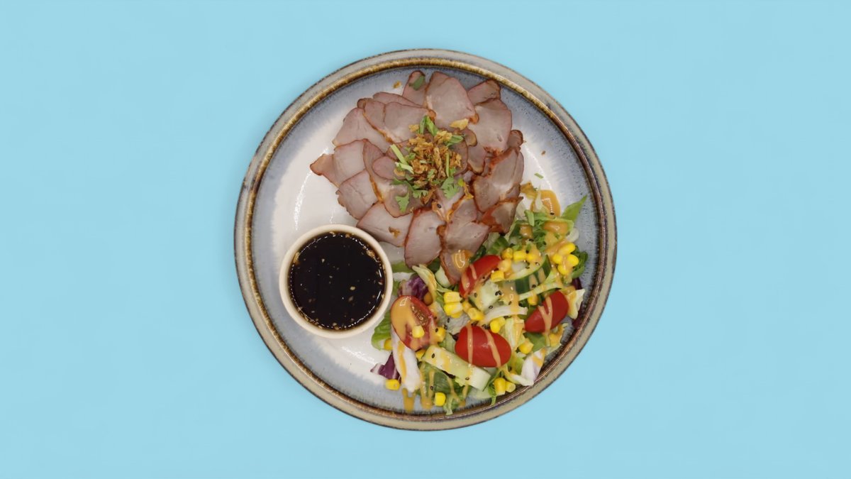 Rice, Salad with Cucumber, Sweet corn, tomato, Pork Char Siu, Soy Sauce, Sesame, Coriander.