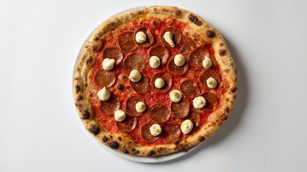 Tomato sauce, vegan pepperoni, cashew ricotta, yeast flakes