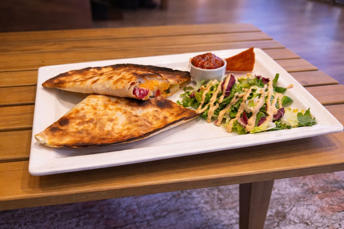 Golden Crispy Flour tortilla stuffed with Sour cream, Pico de gallo, Vegan Sriracha and melted mixed cheese