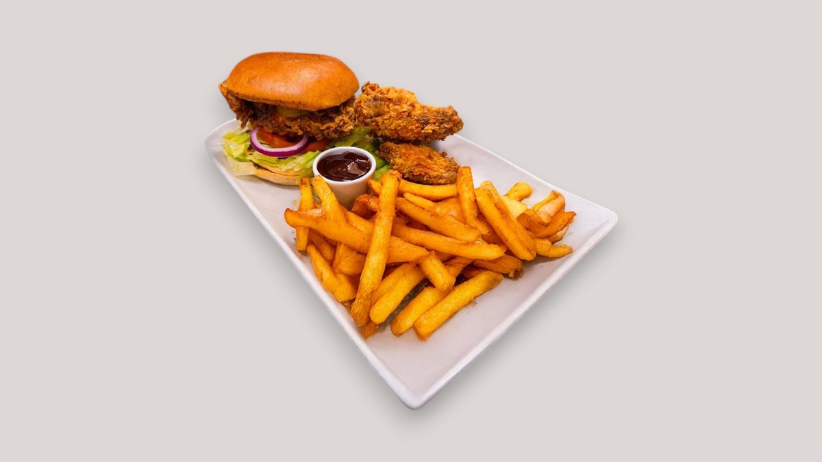 1x Fried Chicken Burger, 3x Wings, 1x Fries, Dippi, 33ml Drinks