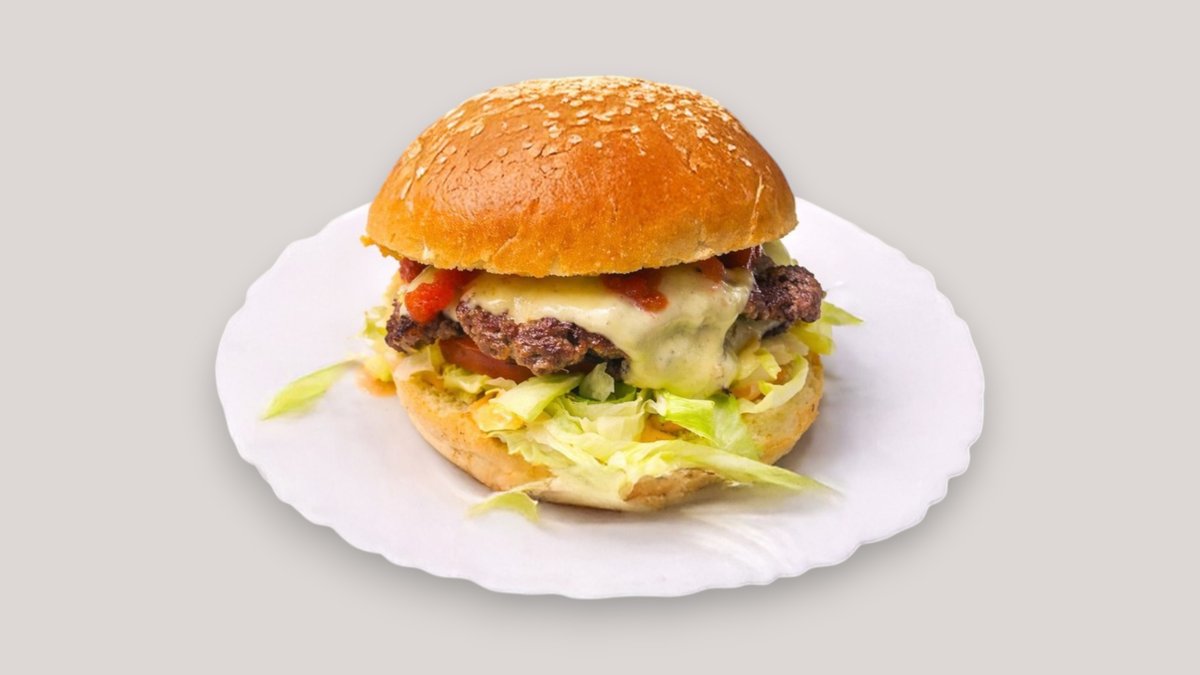 2x (80g) naudanpihvit, cheddar, salaatti, tomaatti, sipuli, suolakurkku, kastike