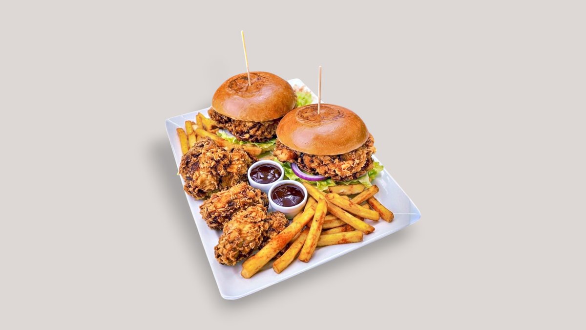 2x Fried Chicken Burger, 6x Wings, 2x Fries,2x Dippi, 2x 33ml Drinks