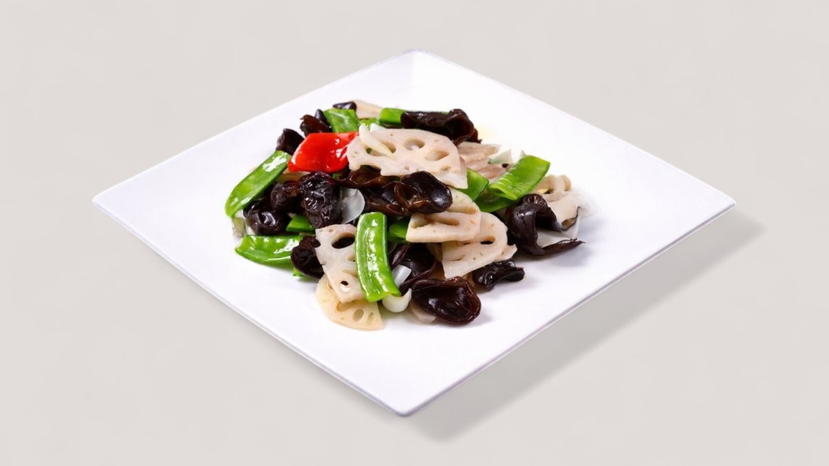 30.荷塘月色 Paistettua lotuksen juurta, sokeriherneitä ja korvasieniä