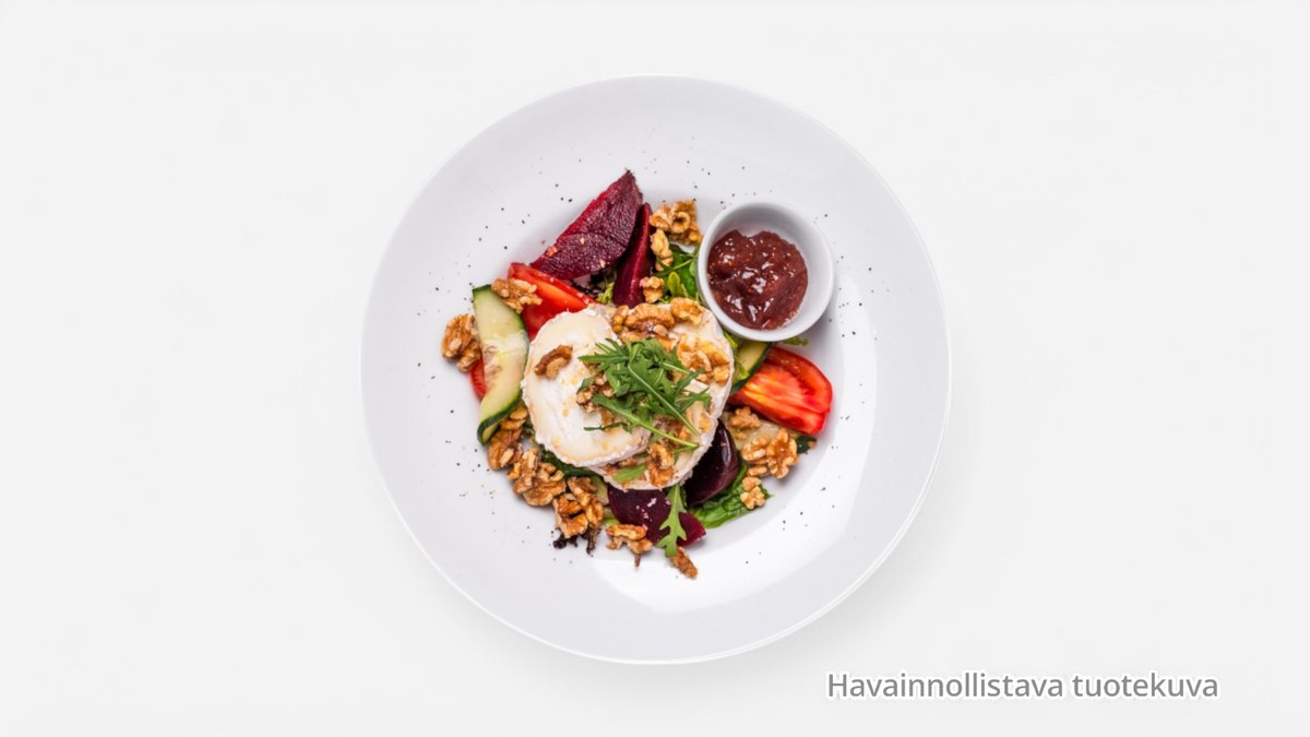 Salaattia, saksanpähkinää, uunijuureksia, tuoretta viikunaa, pariloitua vuohenjuustoa ja balsamicokastiketta