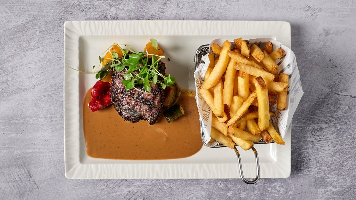 Naudan 100 g lehtipihvi (EU), maustevoita ja ranskalaisia
