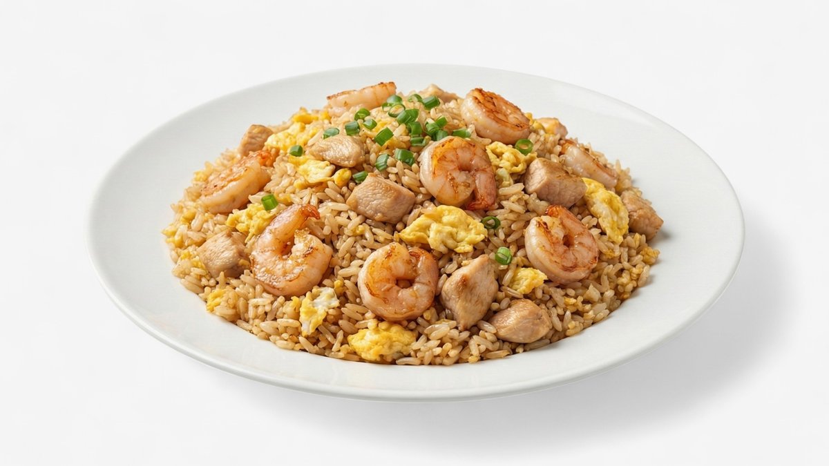 95. Paistettua kananmunaa, riisiä, kanaa ja katkarapuja