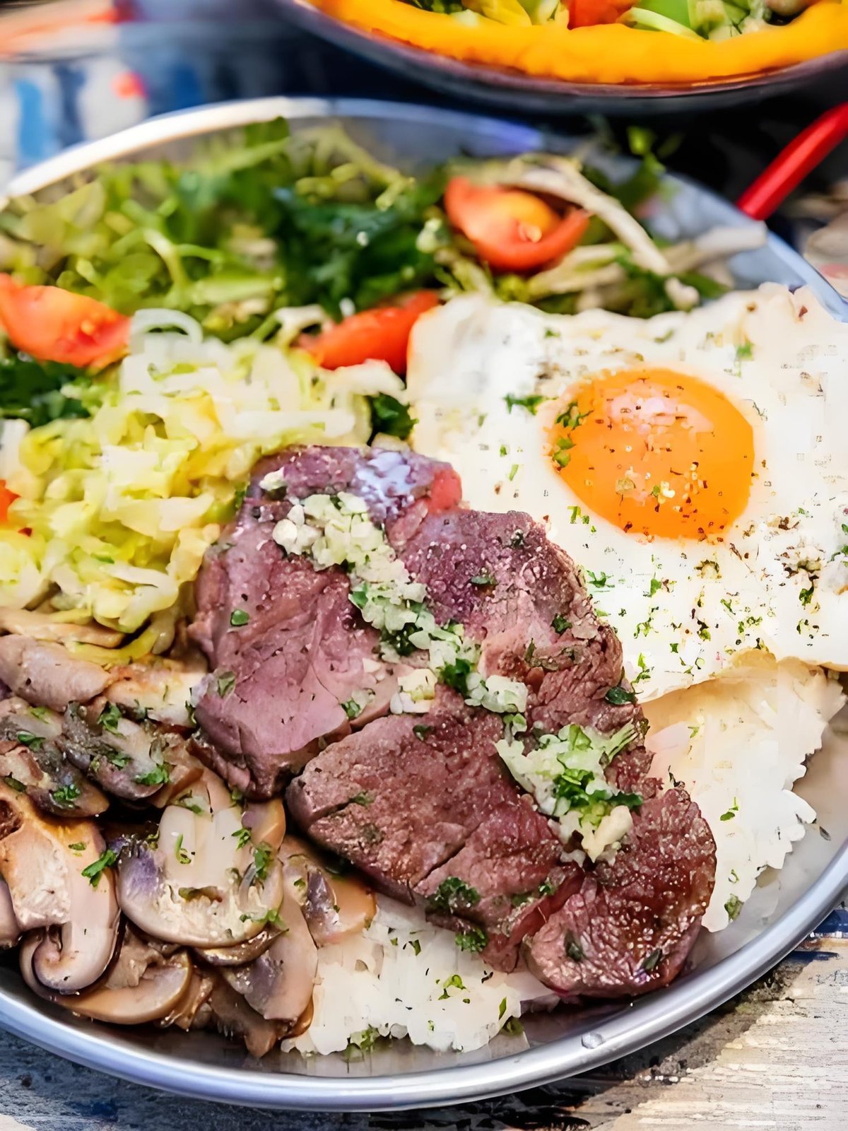 Steamed rice with mixture of vegetables, and an egg. Options: steak【pihvi】