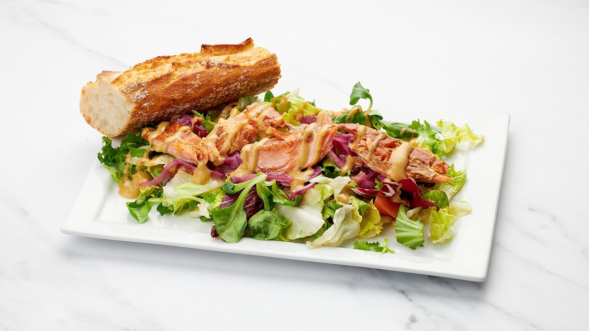 Vihersalaatti, lohi, punasipuli, tomaatti, sinappinen kastike
