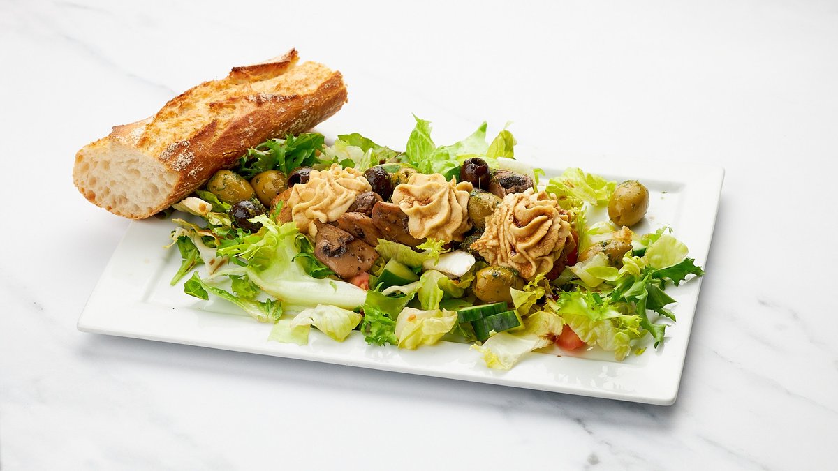 Salaattia, tomaattia, kurkkua, hummus, oliivi, herkkusienet, balsamico kastike