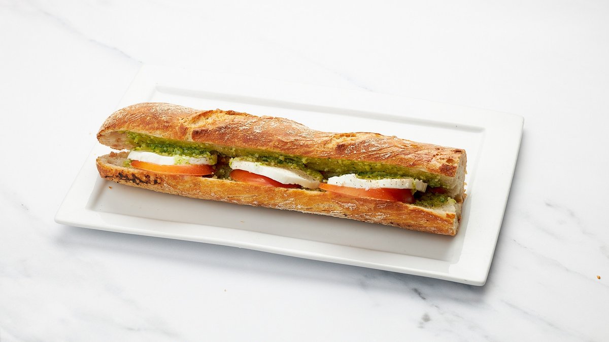 Ekbergin leipomon leipään tehty tuhti sandwich, jossa täytteenä keittiömme valmistama tuore pesto, mozzarellaa sekä tomaattia