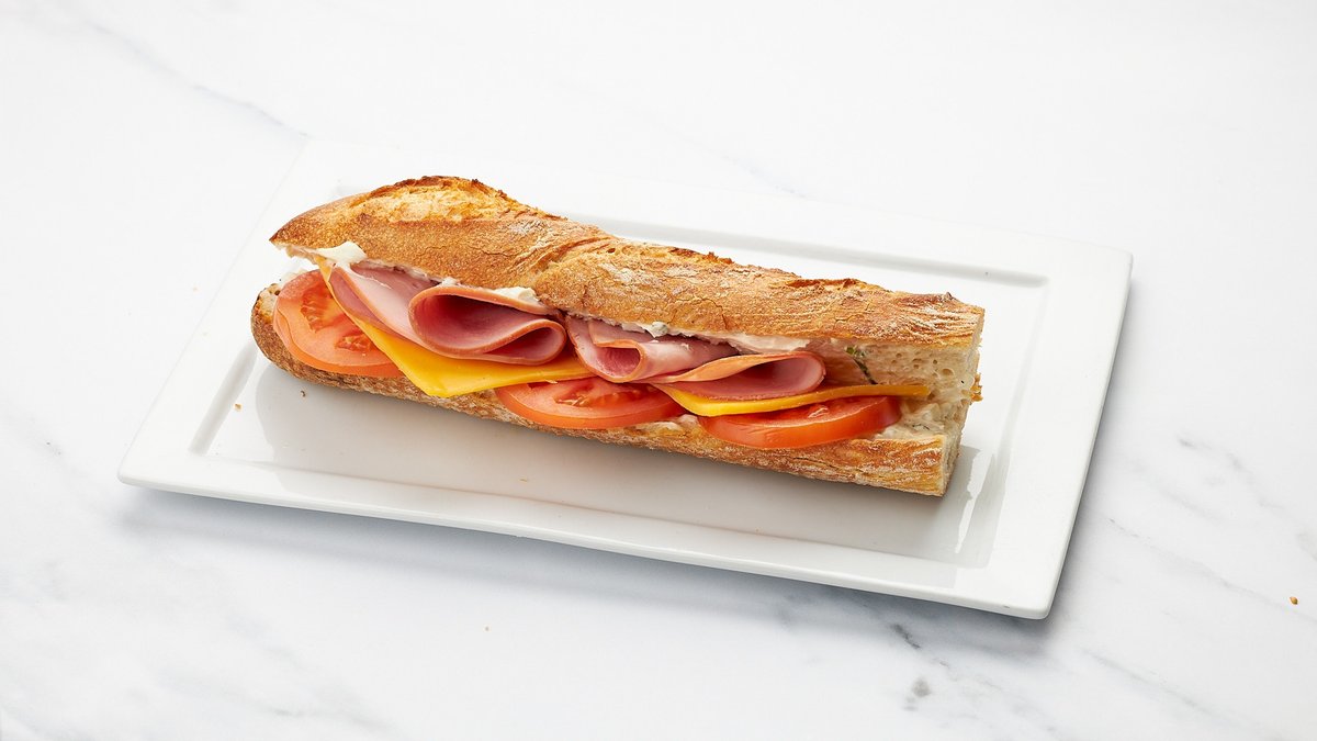Ekbergin leipomon leipään tehty tuhti sandwich, jossa täytteenä keittiömme valmistama remoulade-kastike (sisältää kananmunaa), cheddarjuusto, kinkku ja tomaatti