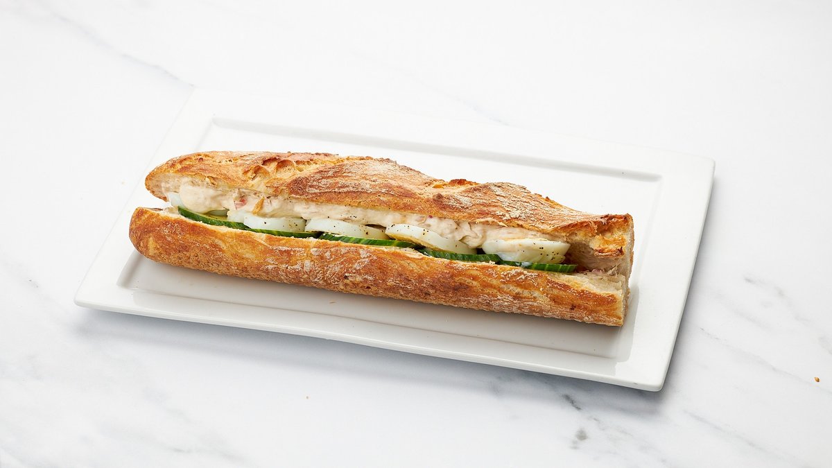 Ekbergin leipomon leipään tehty tuhti sandwich, jossa täytteenä keittiömme valmistama tonnikalalevite, kananmunaa sekä kurkkua