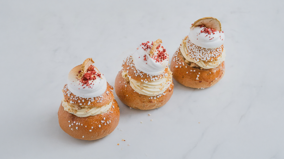 Crumble laskiaispulla (sisällä omenakanelihilloke, kaneliomena crumblea, vaniljavaahtoa, päällä marenkia ja kuivattu omena L