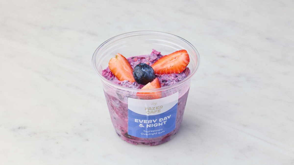 Tuorepuurossa kotimaista pakastevadelmaa, mansikkapyree, kaurajuomaa ja siemen-puurohiutaleita. (veg, M)
