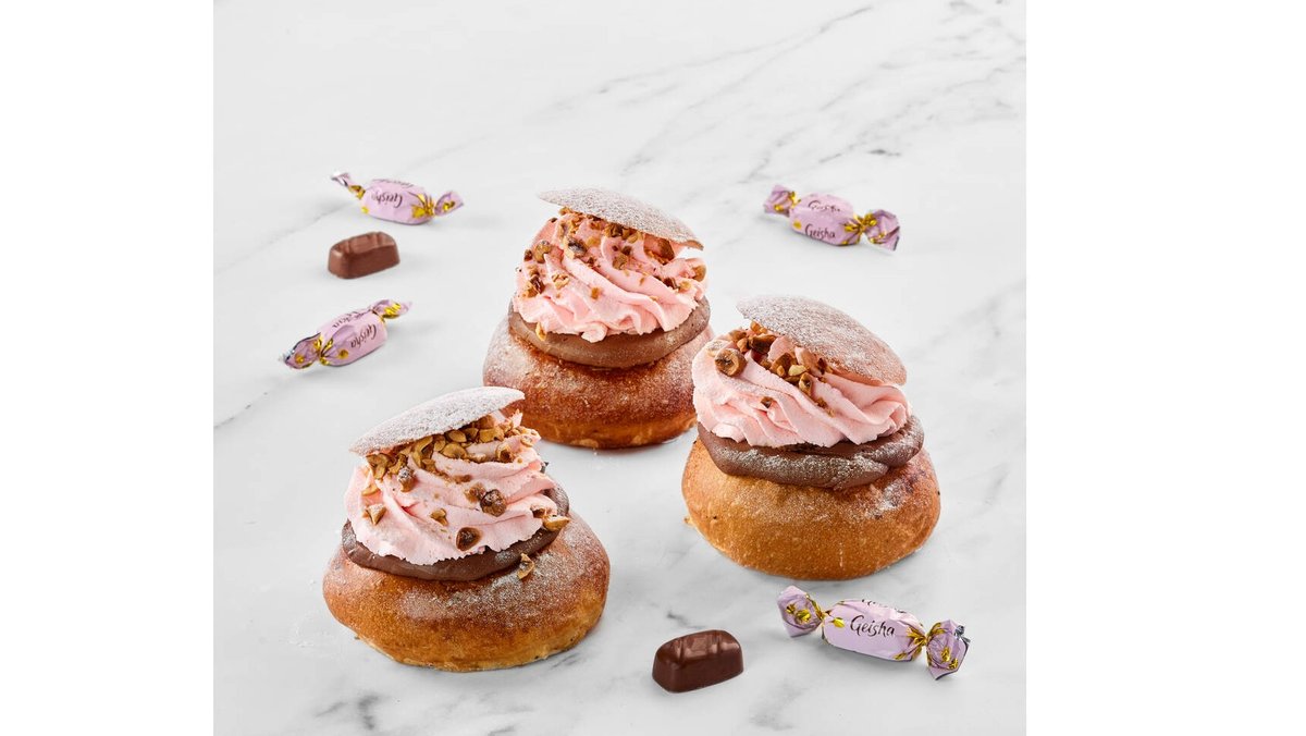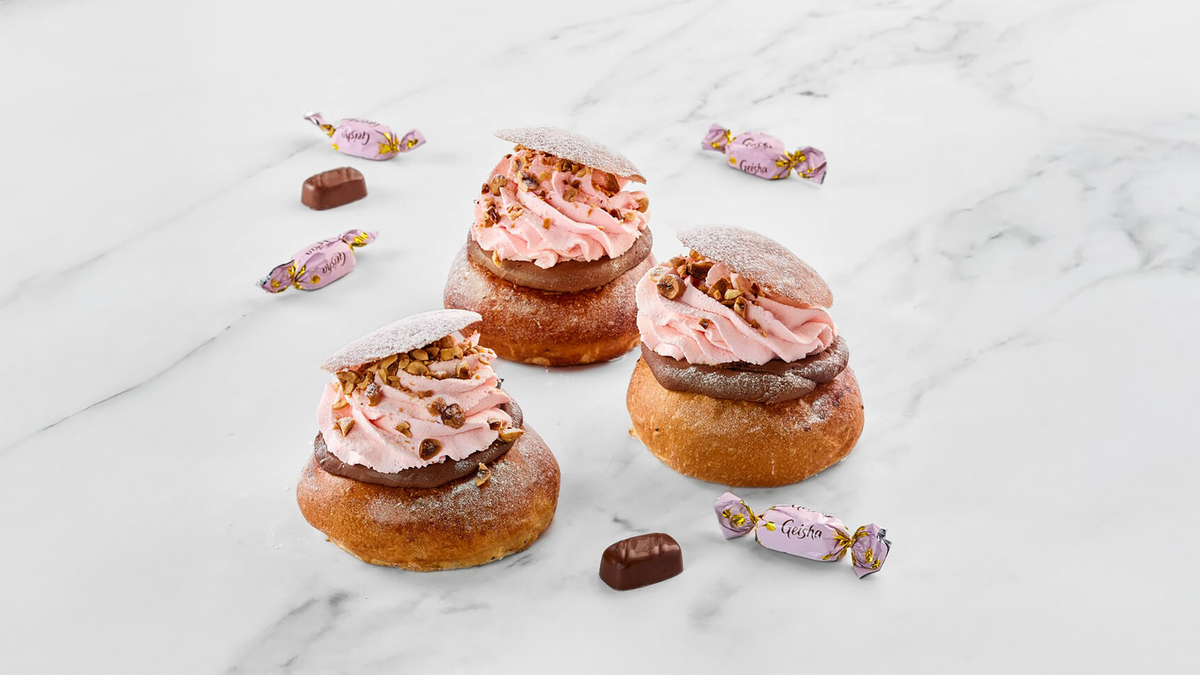 Perinteinen latte maustettuna Geisha-konvehdilla. Sis. pähkinää ja laktoosia.