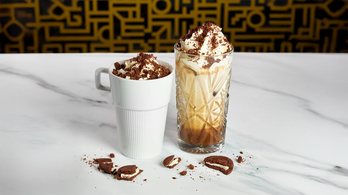 Espressoa, kylmää maitoa, hasselpähkinäsiirappia, suklaata ja kermavaahtoa. Sis. pähkinää ja laktoosia.