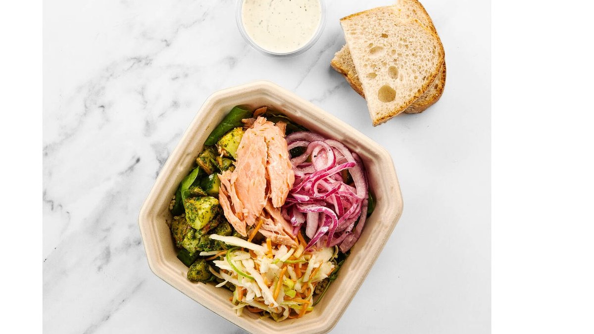 Uuniperuna lämminsavulohi -täytteellä. Annoksessa lisänä vihersalaatti ja kurkku sitrusvinegretillä sekä coleslaw ja yrtti-valkosipuli creme fraiche-kastike ja Grand Blanc -leipä. Laktoositon. Gluteeniton leipä pyydettäessä