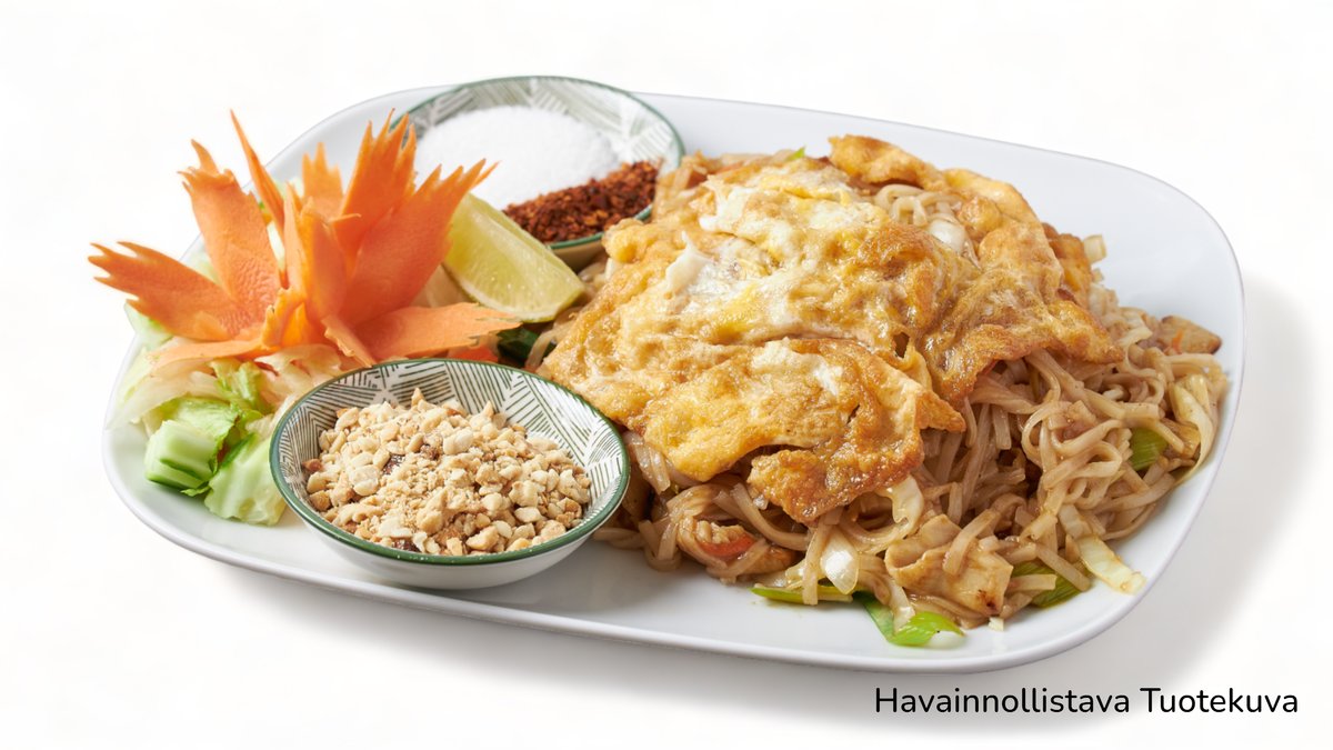 Paistettua nuudelia, kanaa, kasviksia ja kananmunaa