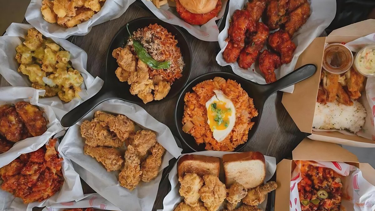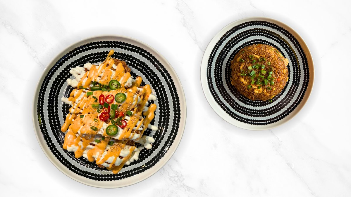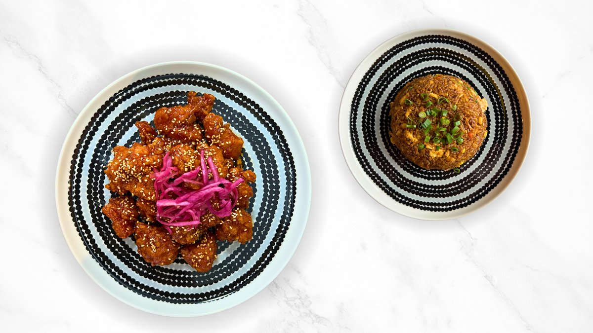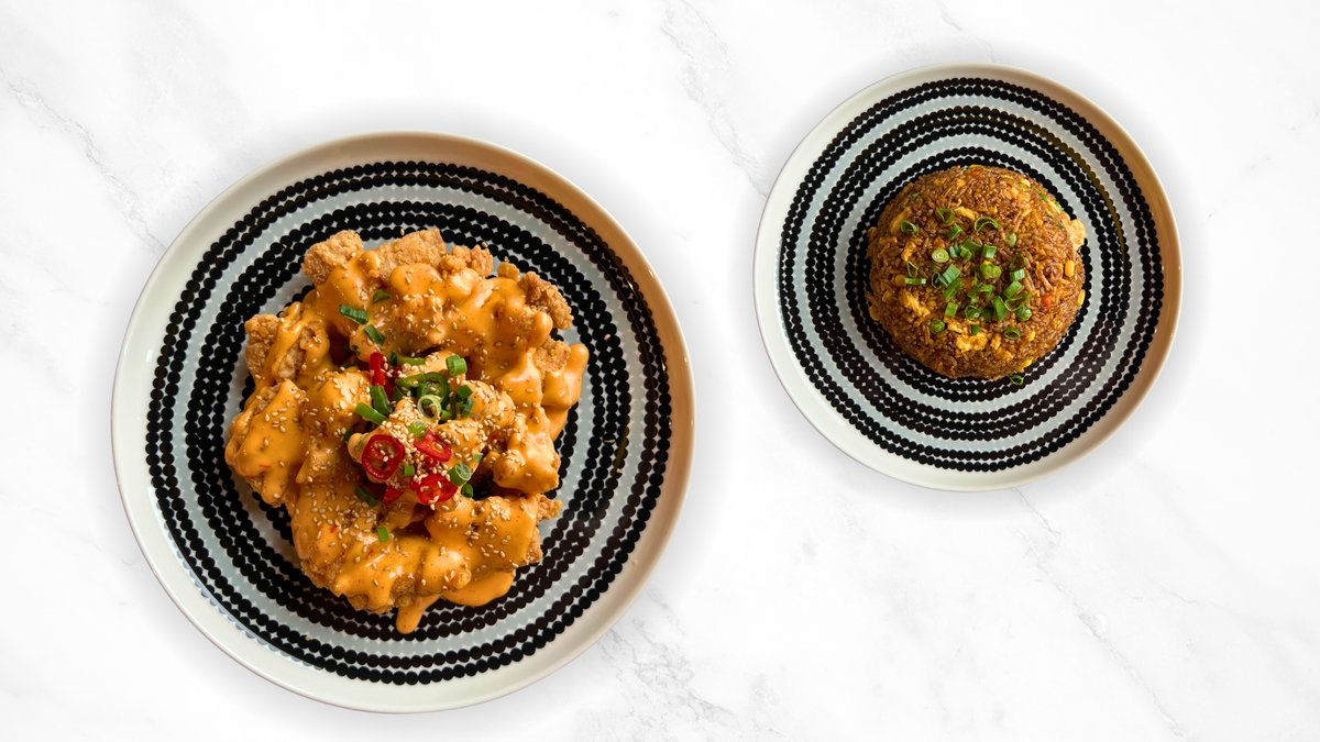 Friteerattu kana, sriracha-kastike, paistettu riisi (kananmuna ja vihanneksia) + Pepsi Max 0,33l