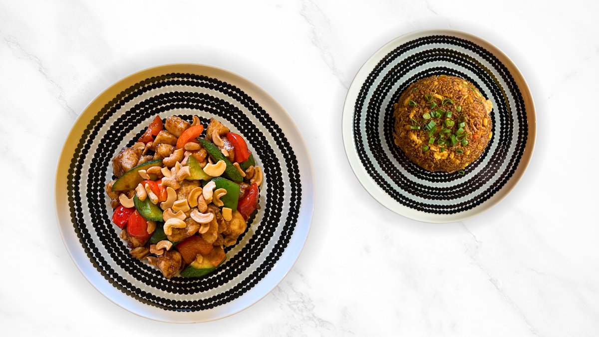 Paistettu kana, kesäkurpitsa, paprika, porkkana, sipuli, cashew pähkinä, paistettu riisi (kananmuna ja vihanneksia) + Pepsi Max 0,33l