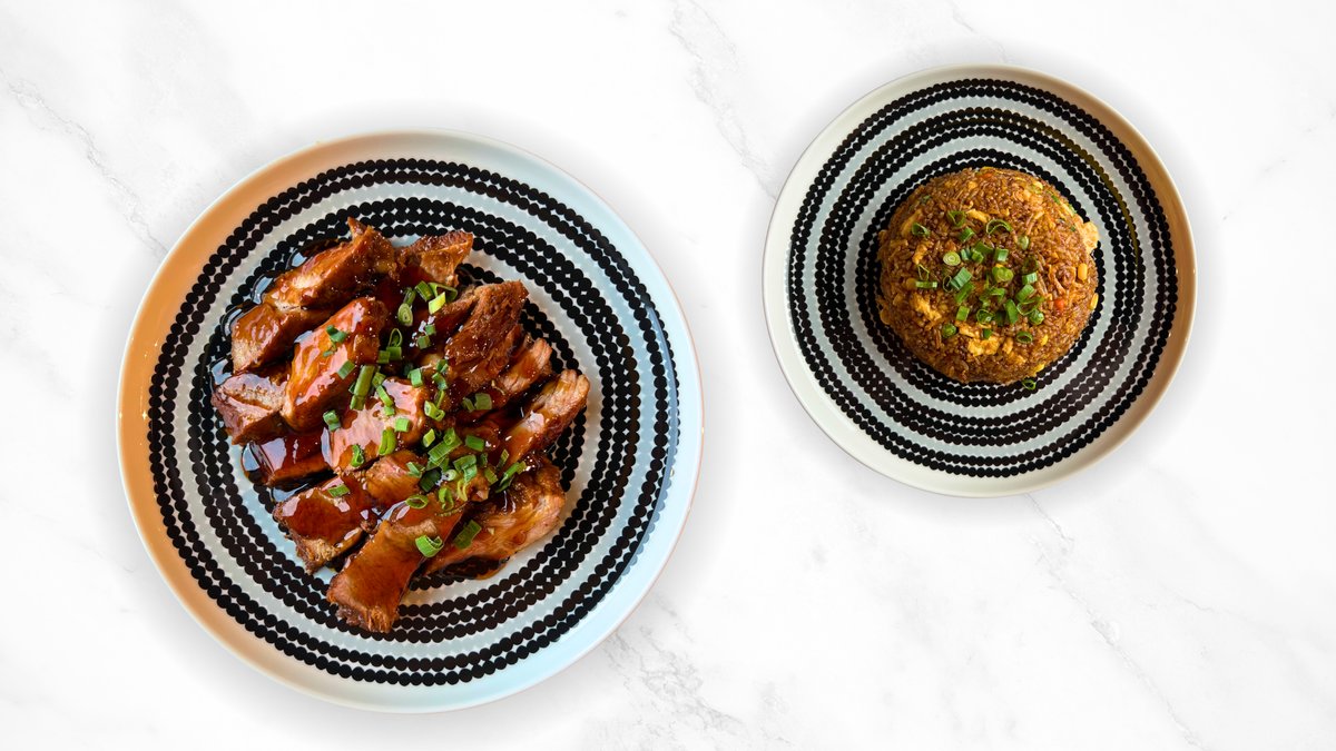 Porsasliha, hunajakastike, paistettu riisi (kananmuna ja vihanneksia) + Pepsi Max 0,33l
