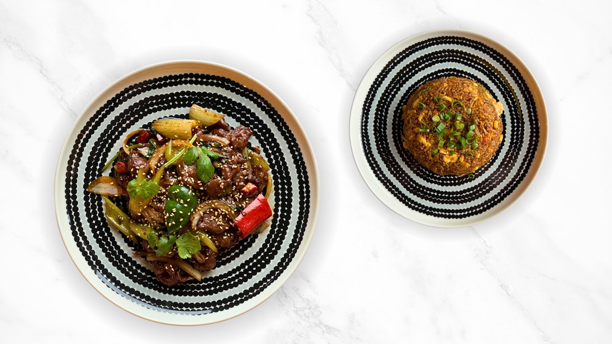 Paistettu naudanliha, kesäkurpitsa, paprika, porkkana, sipuli, korianteri, paistettu riisi (kananmuna ja vihanneksia) + Pepsi Max 0,33l