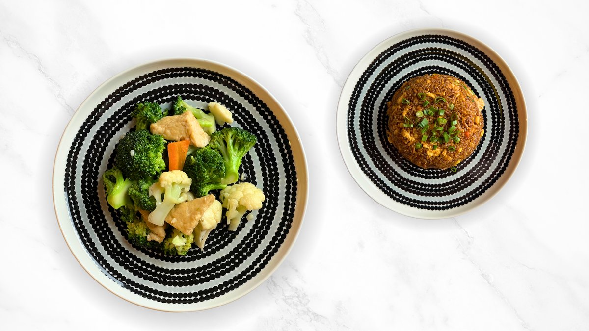 Parsakaali, kukkakaali, kesäkurpitsa, paprika, porkkana, paistettu riisi (kananmuna ja vihanneksia) + Pepsi Max 0,33l