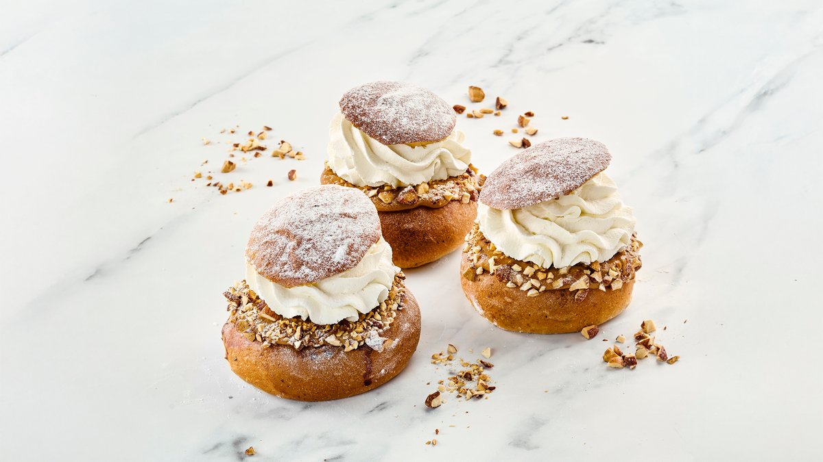 Vuoden 2026 uutuuspulla! Laskiaispullassa on kinuski-mantelitäyte, mascarpone-vaahtoa ja karamellisoituja manteleita. Vähälaktoosinen.
