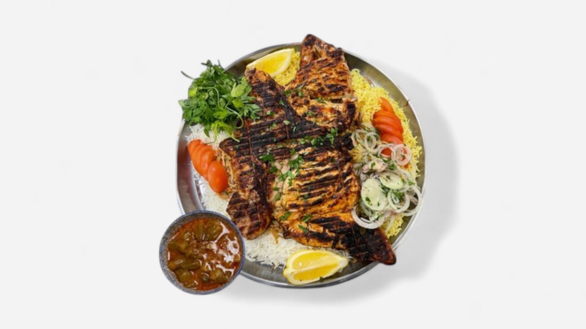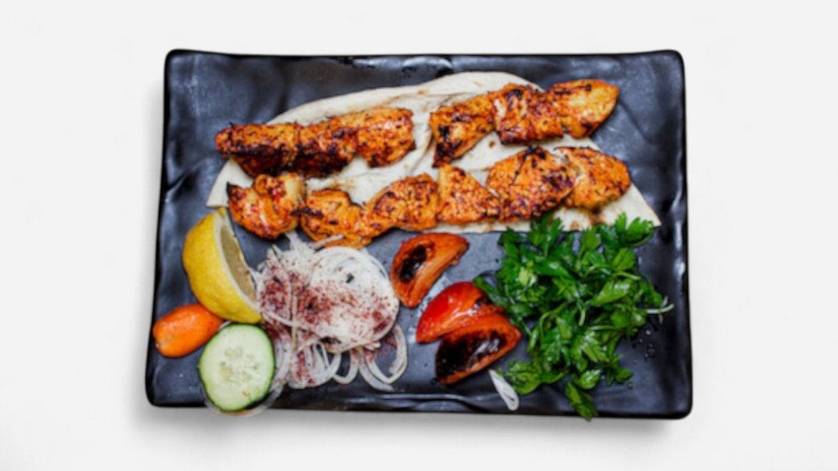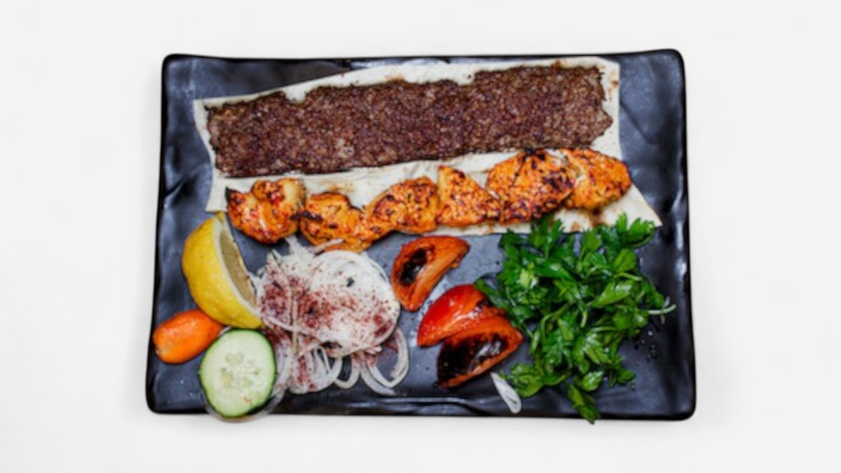 Kebab, shish kana, naudan maksa, ranskalaiset, riisi