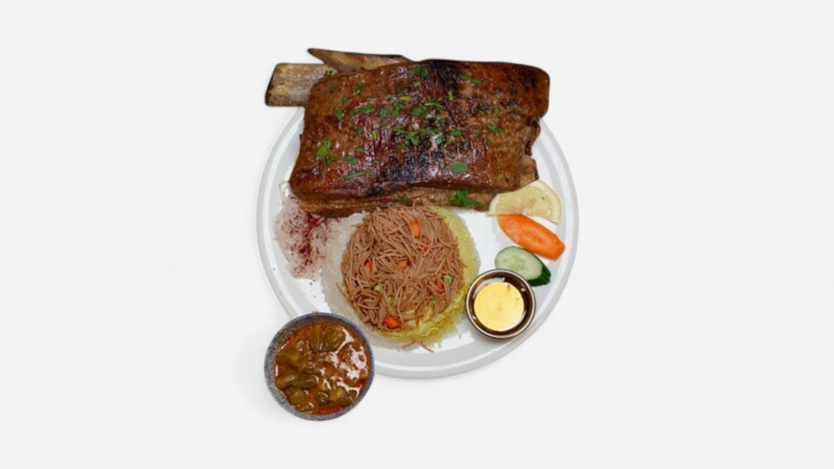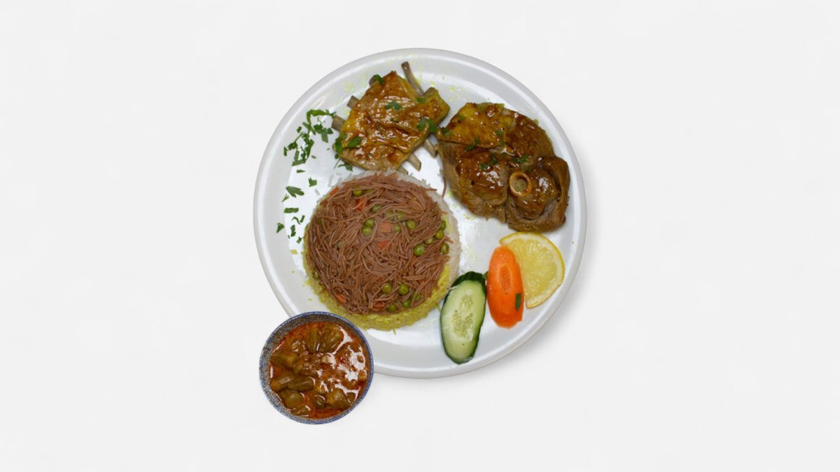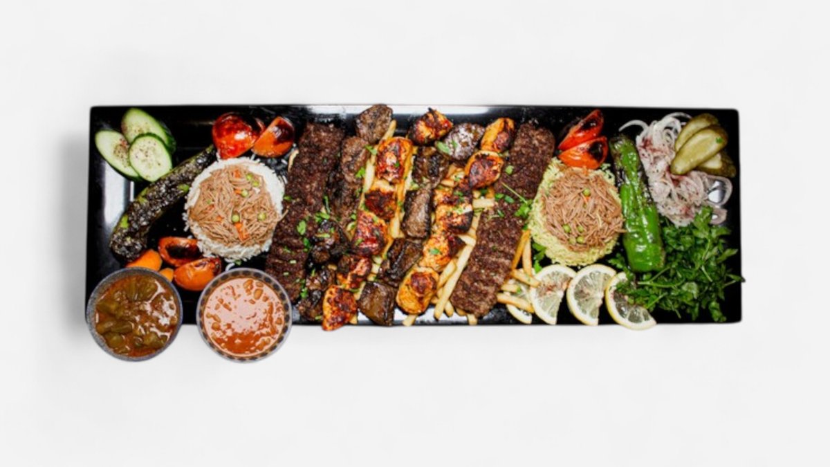 Naudan ribs tai lampaanliha, kebab, shish kana, shish lammas, naudan maksa, ranskalaiset, riisi