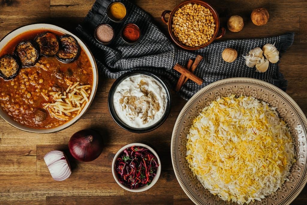 Choose three starters: kashk bademjan, dolmeh (stuffed vine leaves), mirza ghasemi, or shirazi salad Choose two main courses: saffron butter grilled chicken with Persian saffron rice, ghormeh sabzi with Persian saffron rice, gheimeh bademjan stew with Persian saffron rice or grilled tofu with herbs & special sauce. The side dish includes grilled potatoes with dill + fresh herbs + lemon + marinated olives, fresh bread + mixed pickles + liteh pickles. For dessert, chocolate cake. For a drink saffron syrup + fresh lemonade.