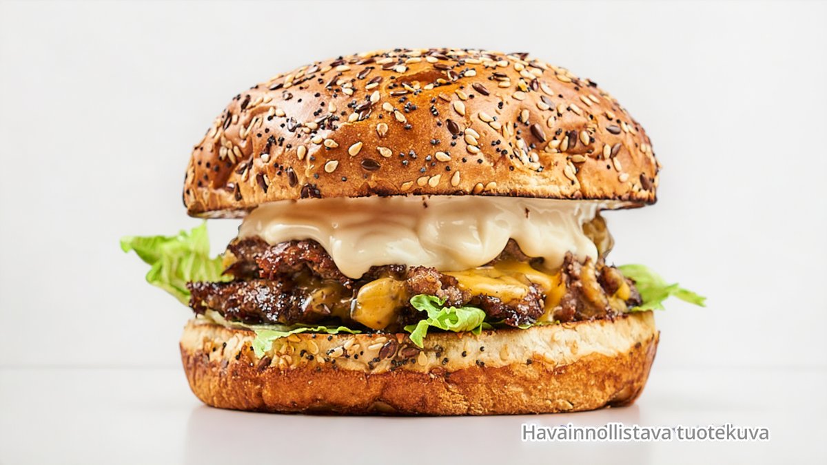 Jauhelihapihvi, cheddarjuustoa, pekonia, tomaattia, marinoitua punasipulia, chilimajoneesia, maalaisranskalaiset ja coleslaw -salaattia