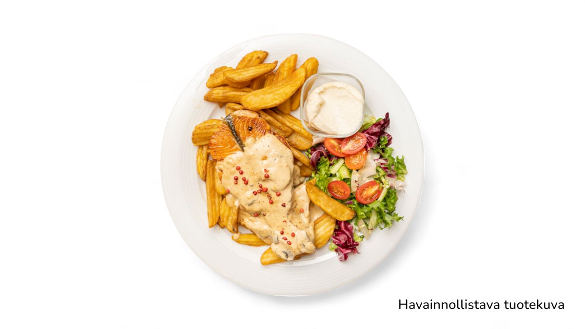 Kasvispihvi 120g, cheddarjuustoa, salaattia, tomaattia, valkosipulimajoneesia, suolakurkkua, marinoitua punasipulia, maalaisranskalaiset ja coleslaw-salaattia