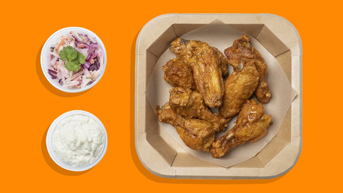 ⚠️ NOTICE ⚠️ Our wings ARE NOT SWIMMING in sauce – because we like 'em crispy! 8PCS – Fried chicken wings, sauce rubbed on, dip and side salad.