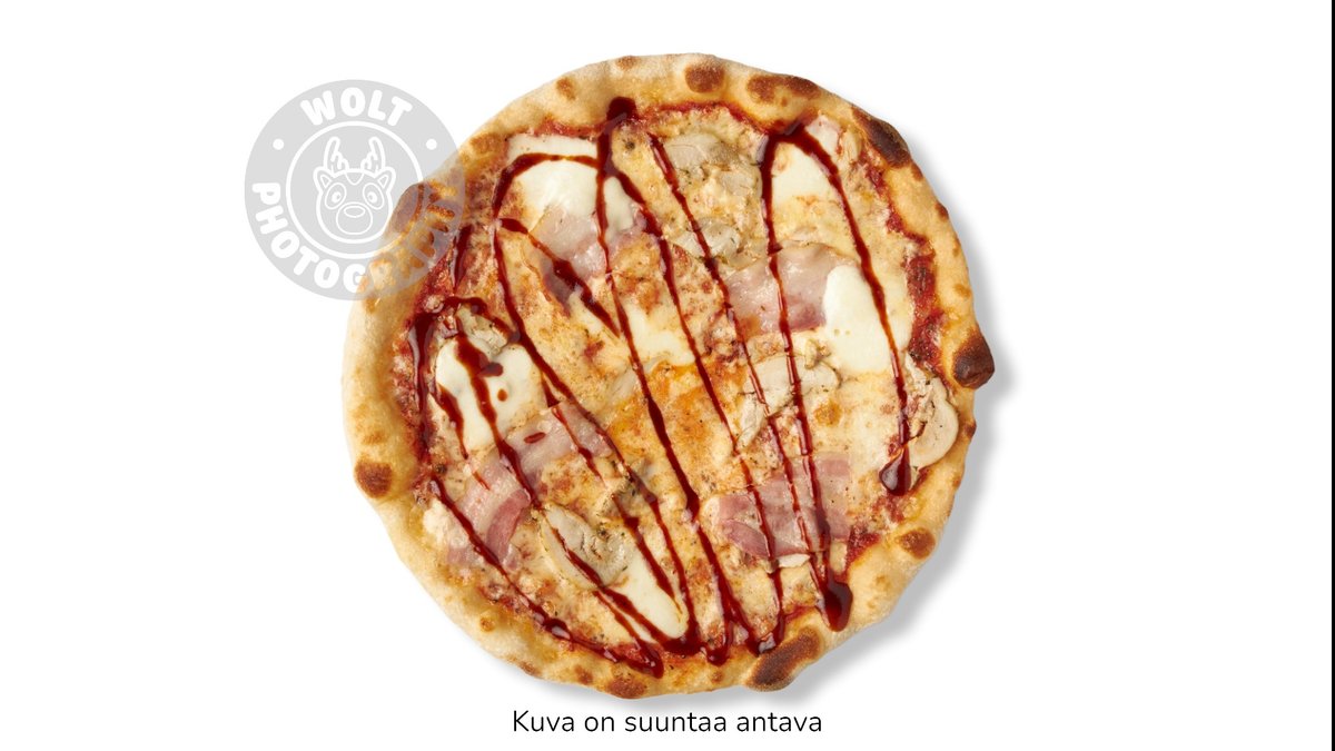 Broileri, mozzarellajuusto, punasipuli, BBQ-kastike, pekoni