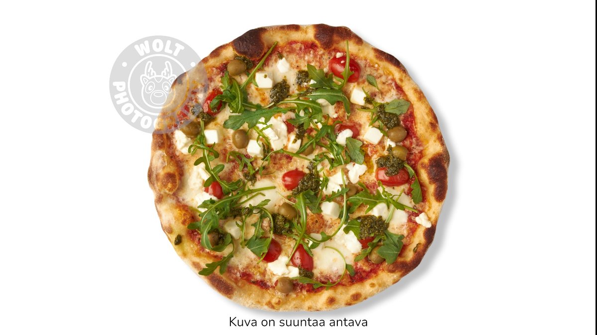 Herkkusieni, paprika, oliivi, sipuli, rucola, vegaanijuusto