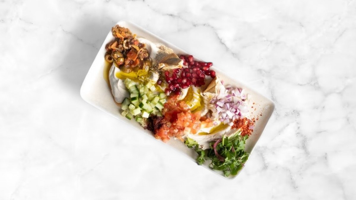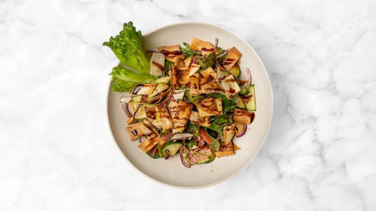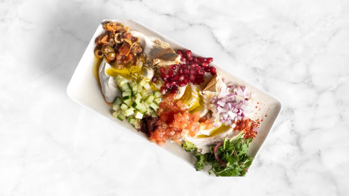 Cherry tomatoes, cucumber, olives, onion, mint, extra virgin olive oil