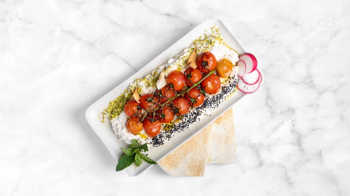 Labneh w/ broken wheat topped with roasted cherry tomatoes, basil, and pistachio