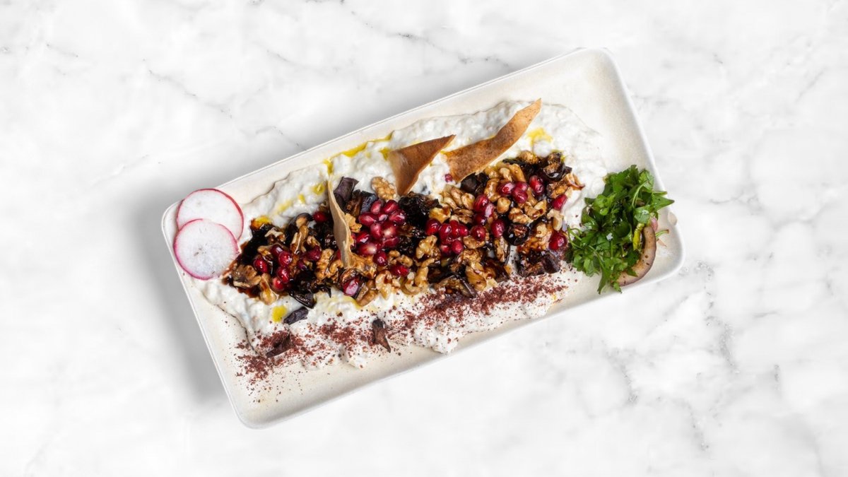 Roasted eggplant mashed with tahini, topped w/ pomegranate seeds and molasses