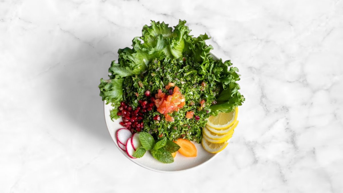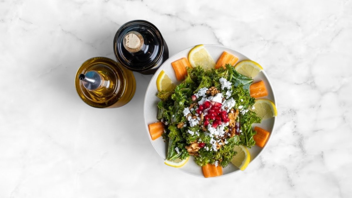 Kale leaves, mejdool dates, orange, crushed walnuts, tahini sauce and feta cheese