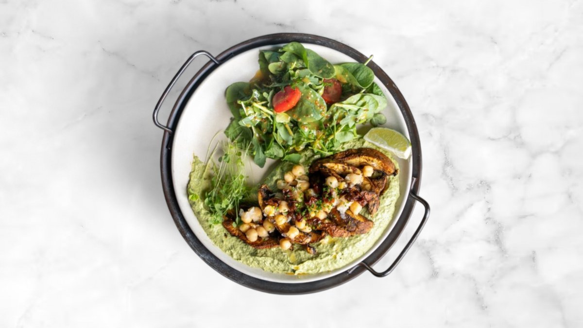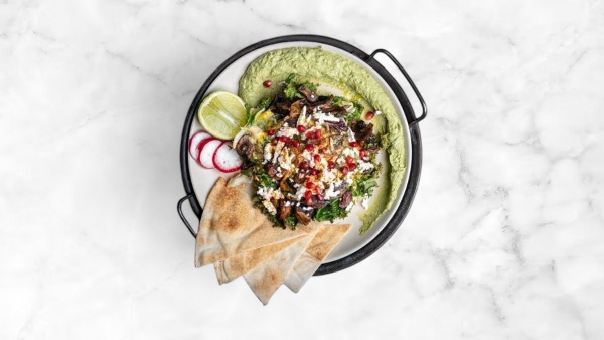 Portobello mushroom in shawarma style, pesto hummus, sundried tomato