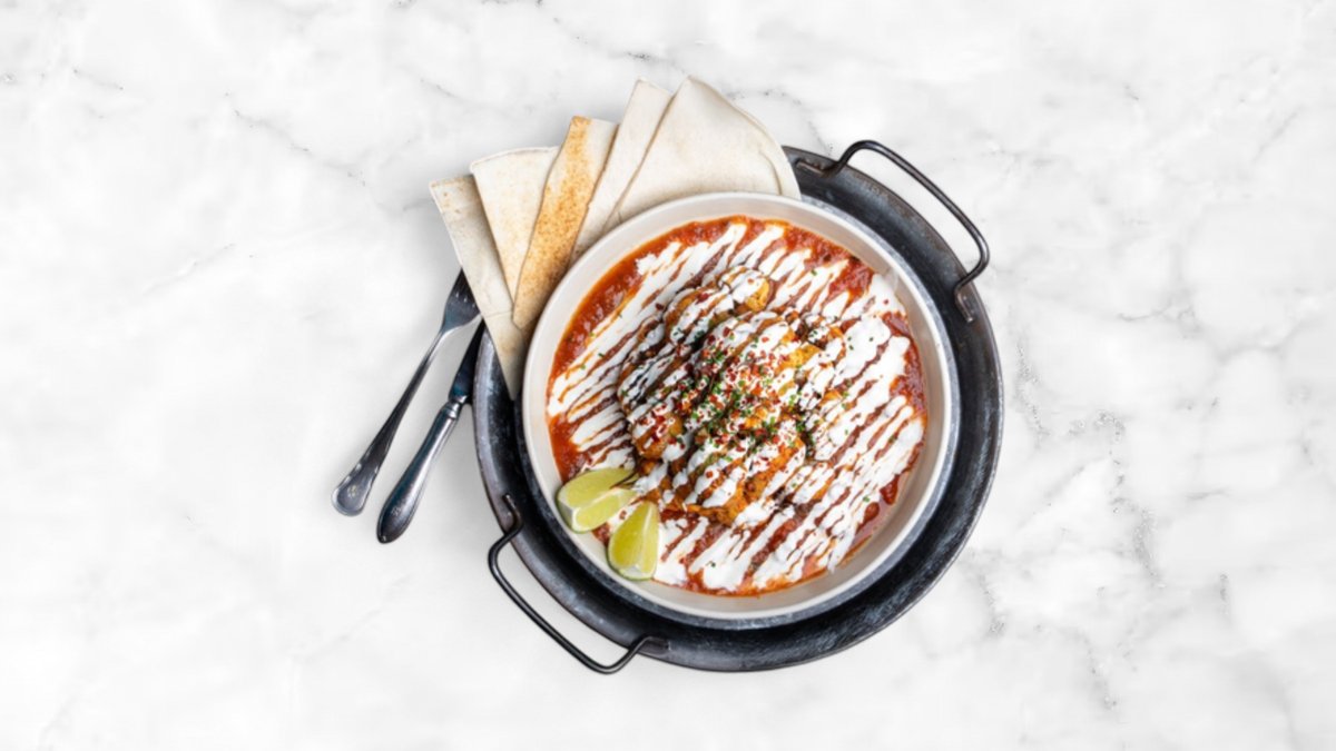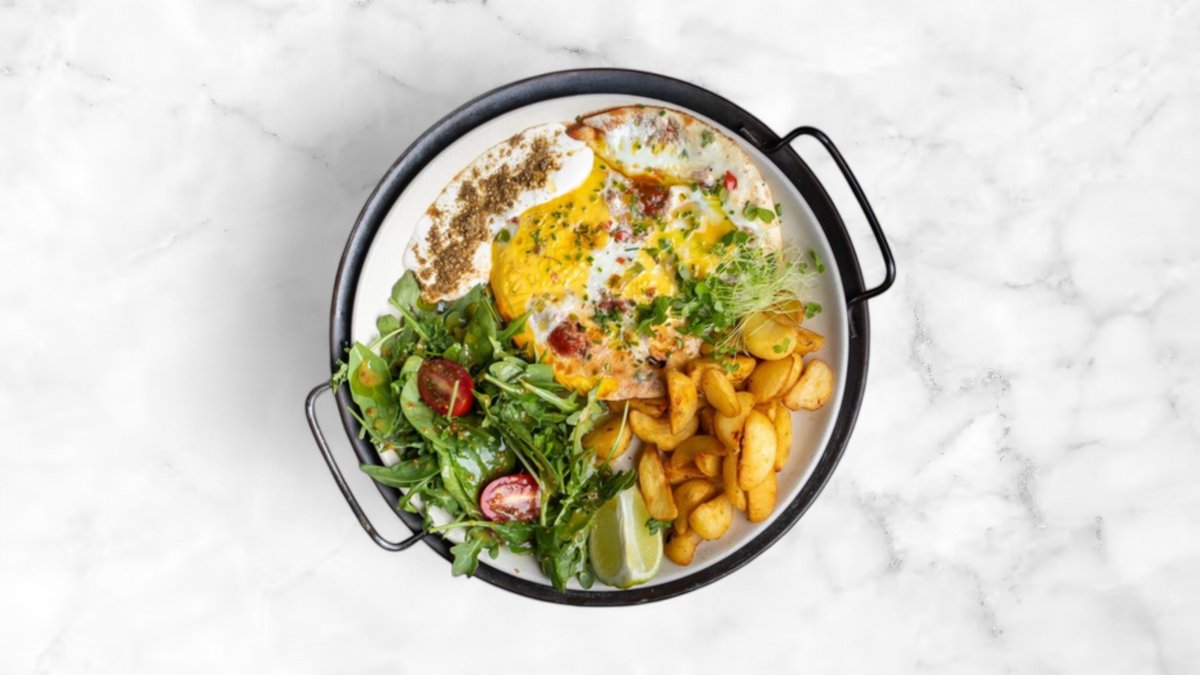 Egg in a home-made spicy tomatoes sauce served w/ tahini sauce and potato harra