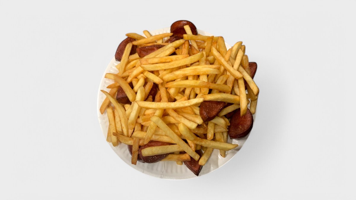 Ranskalaisia ja leikattu uunimakkara uppopaistettu ja kastiketta mukaa