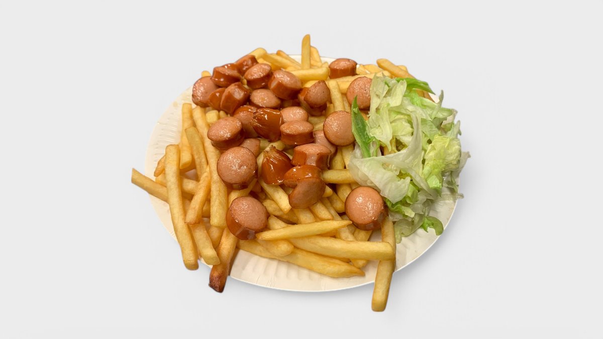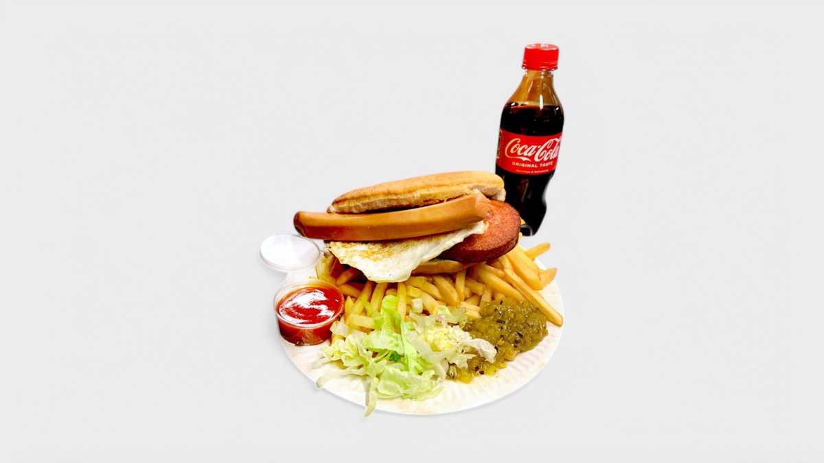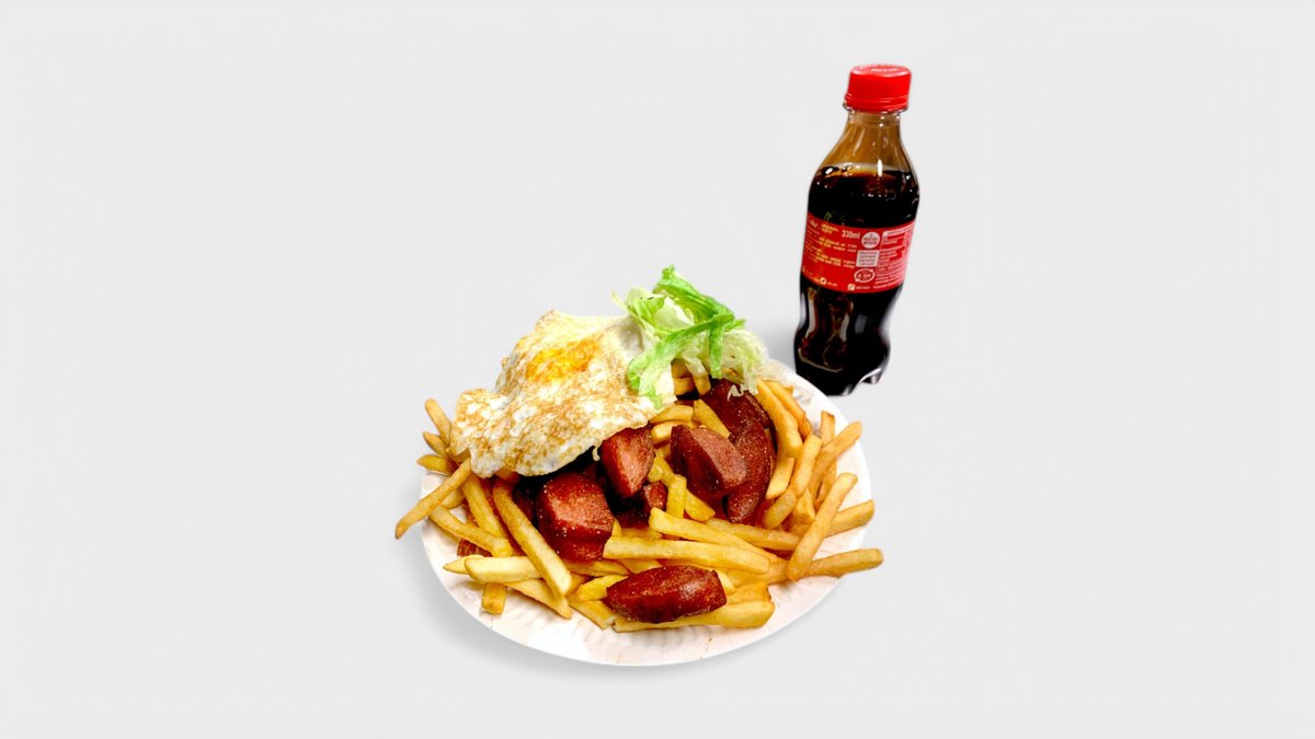 Makkaraperunat, paistettu kananmuna, 0,33l virvoitusjuoma, ranskalaiset ja kastike mukaan