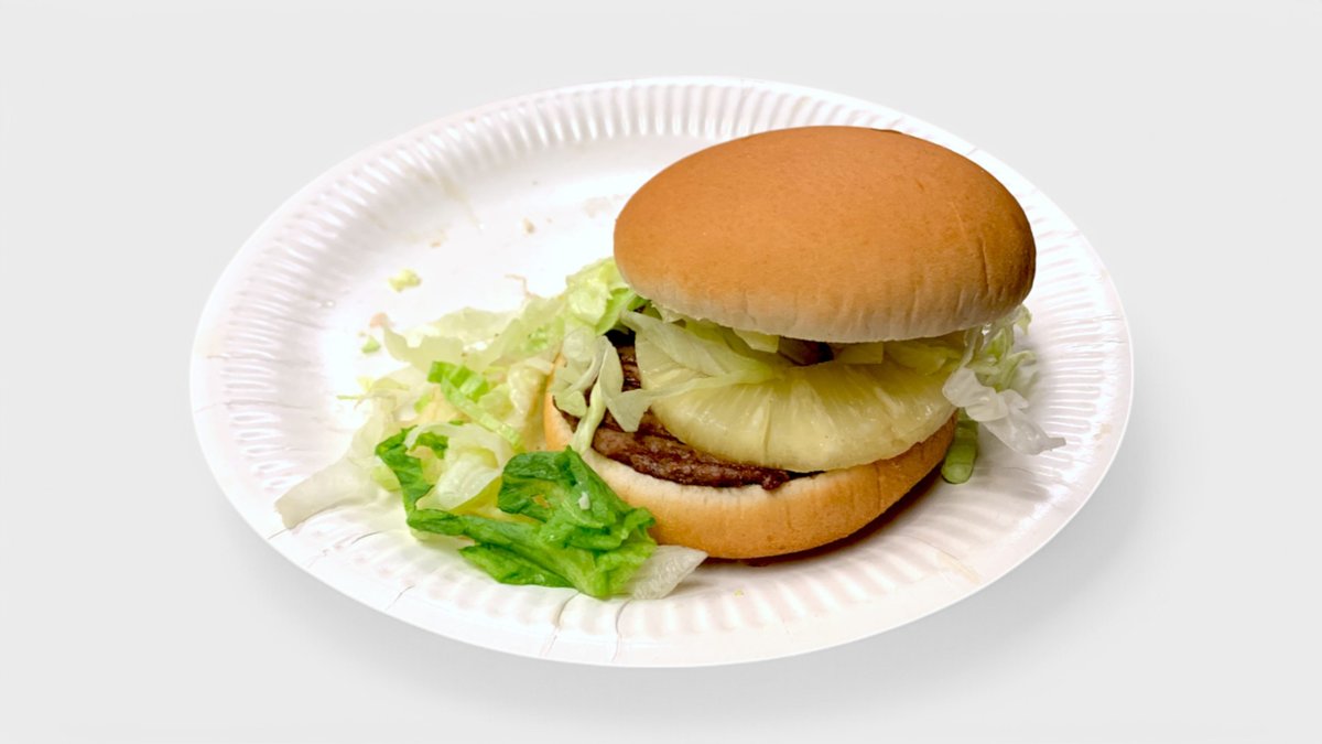 Sämpylä, naudanlihapihvi 45g, ananas, salaatti sekä salaatinkastike