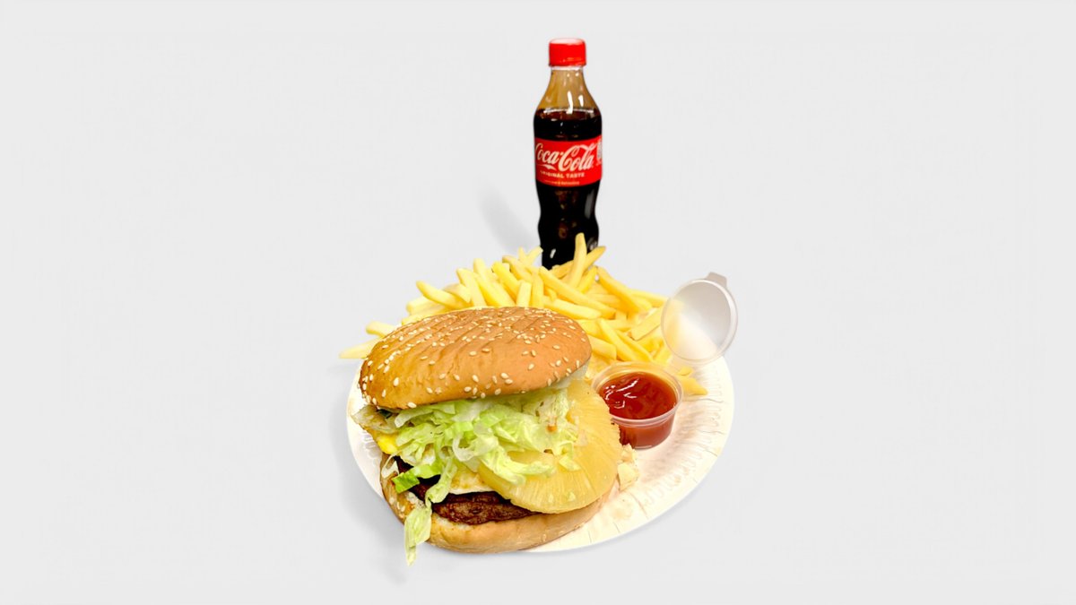 Iso sämpylä 100g naudan jauhelihapihvi, pekoni, cheddarjuusto, paistettu kananmuna, ananas, salaatti sekä kastike