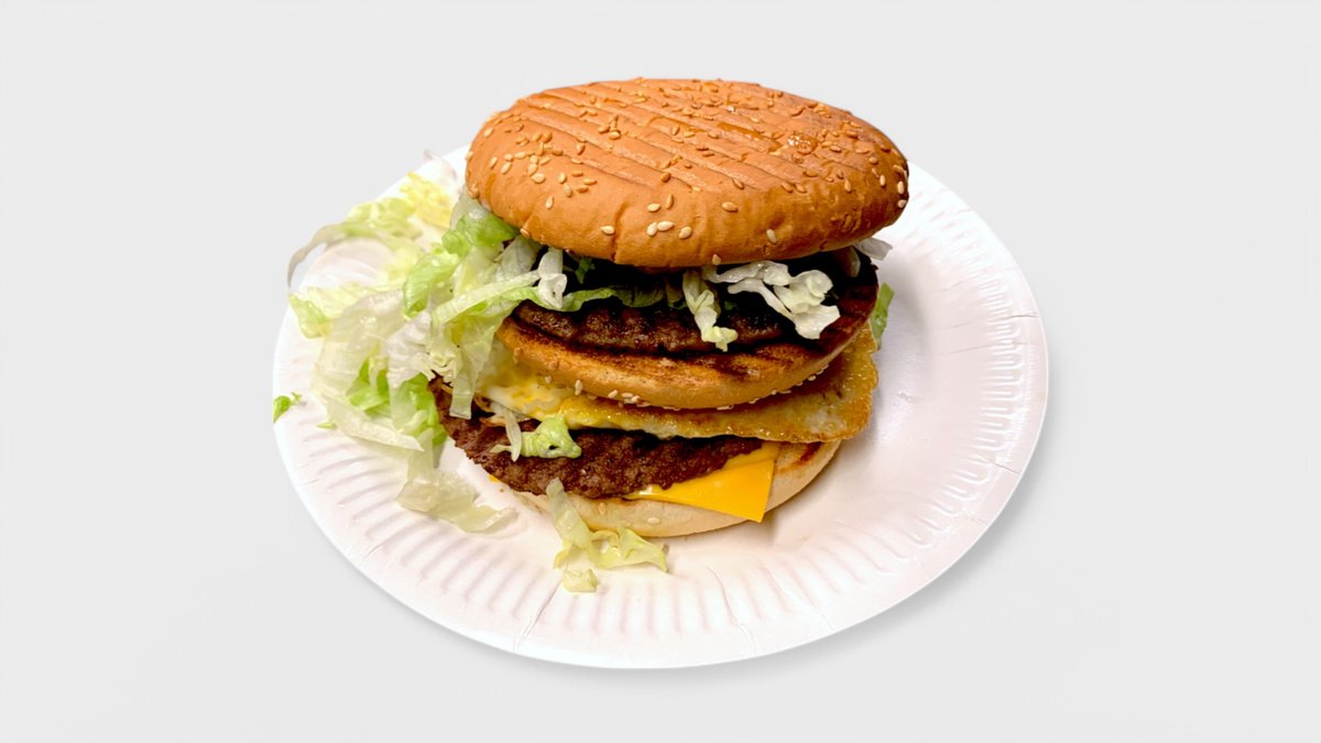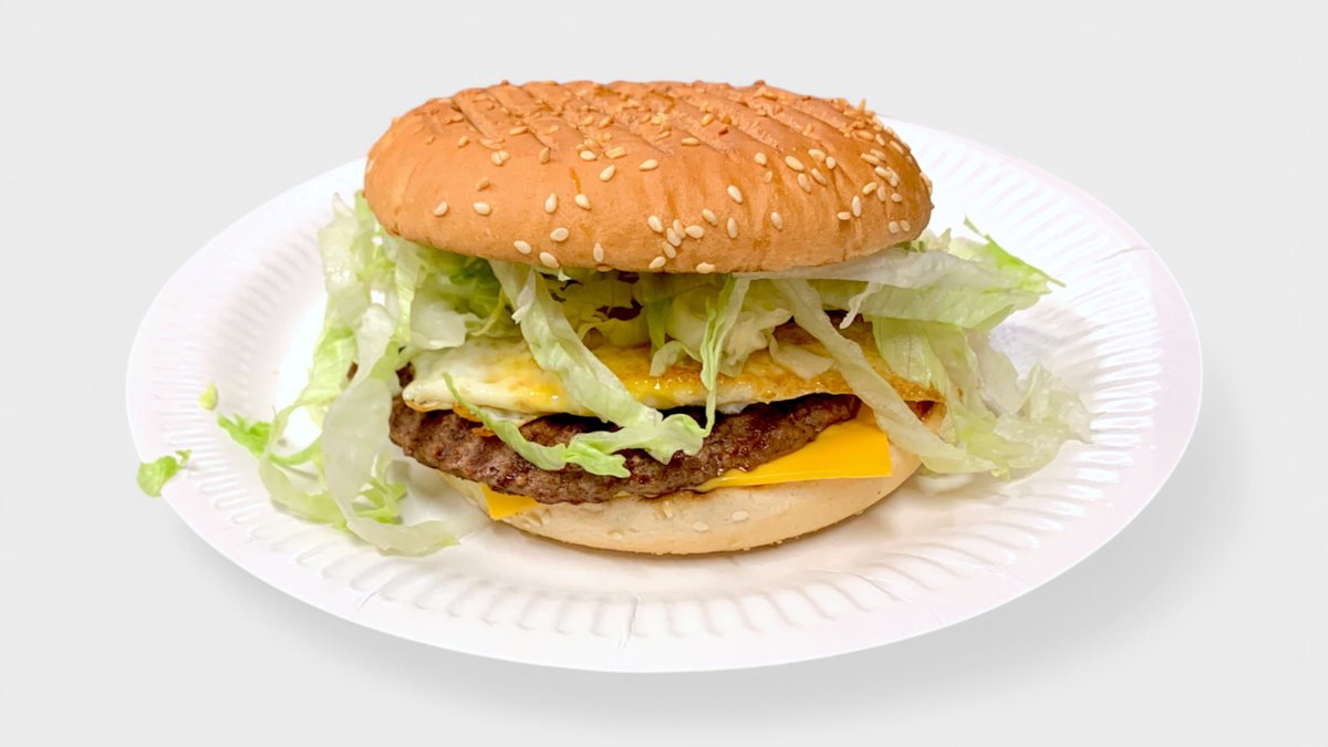 Iso kerrosämpylä, 2x100g naudan jauhelihapihvi, paistettu kananmuna, cheddarjuusto, salaatti sekä kastike
