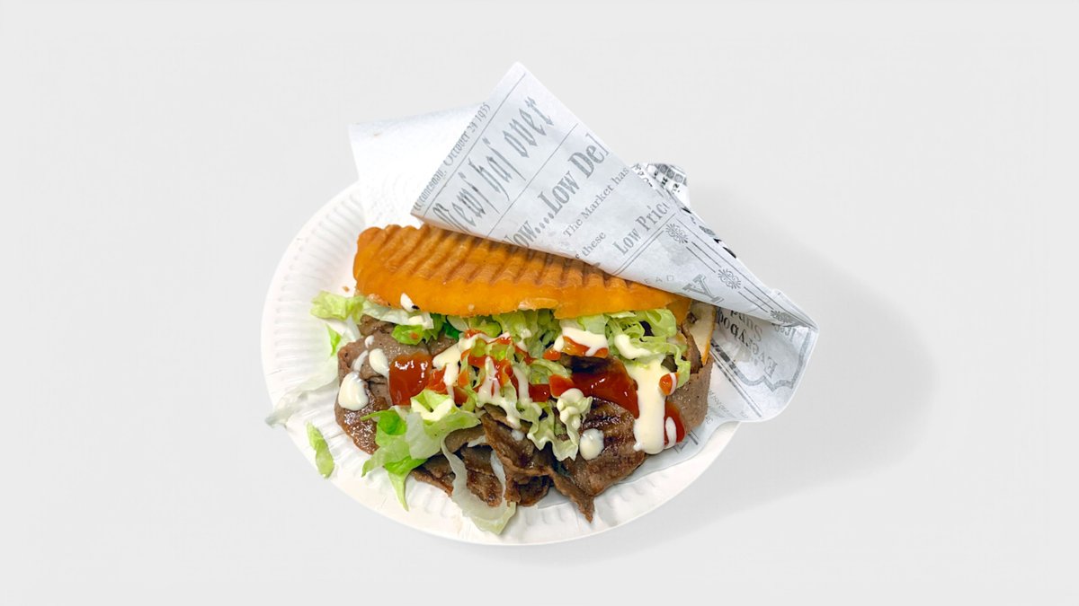 Jättilihapiirakka, kebabliha, salaatti sekä kastike