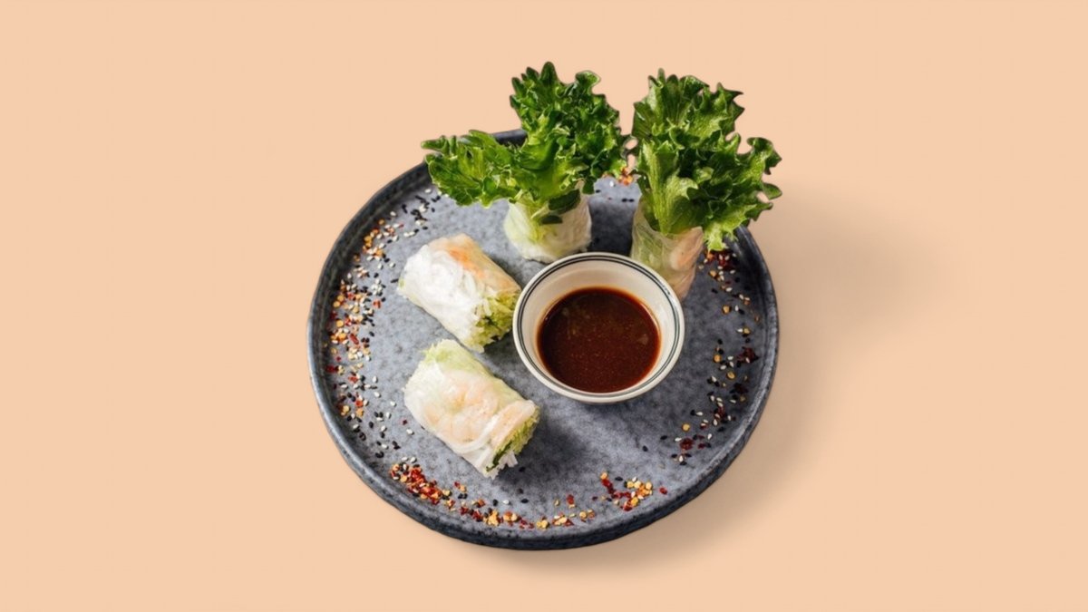 Two classic light soft rice paper rolls filled with vegetables, fresh herbs, rice noodle and hoisin sauce